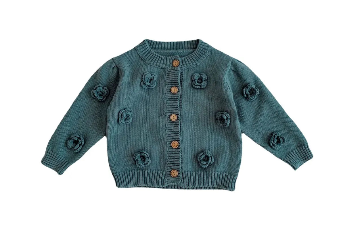 A cozy and stylish knit cardigan featuring delicate 3D floral details and natural wood buttons. Made from soft cotton, perfect for layering and everyday wear. Boutique quality with timeless charm.