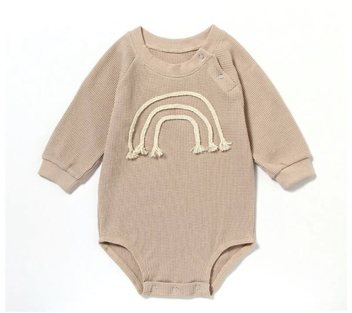 Soft, minimal, and effortlessly charming, our Waffle Rainbow Long Sleeve is the perfect balance of comfort and boutique style. Crafted from breathable, premium waffle-textured cotton, this long-sleeve onesie keeps your little one cozy while offering plenty of stretch for playful movement.