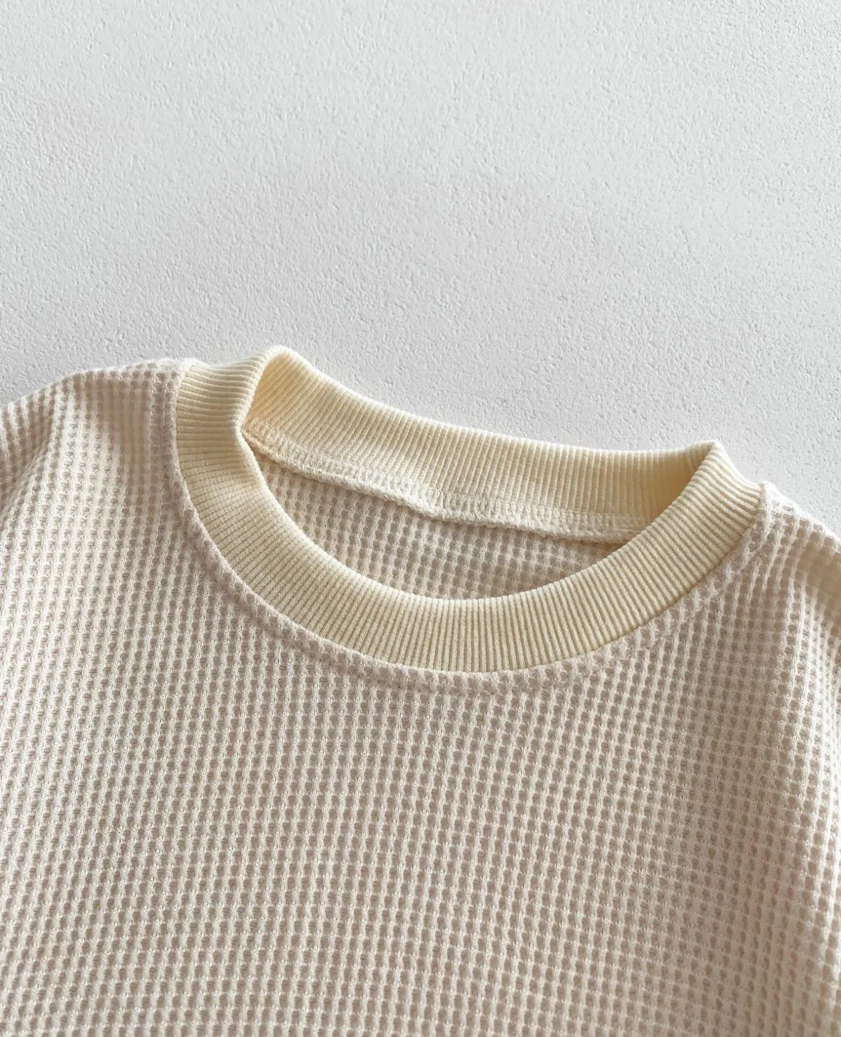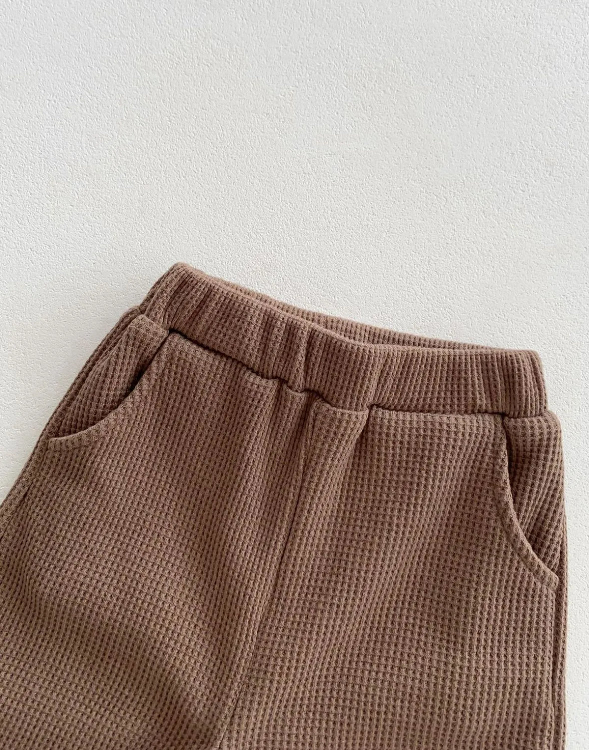 Effortlessly chic and endlessly comfortable, our Waffle Lounge Set is designed for the little one who deserves luxury in every detail. This 2 piece set pairs a relaxed fit top with contrast seam detailing jogger pants. Crafted from a premium waffle textured organic cotton. Available in a cream top with contrasting brown bottoms or a brown top with contrasting light brown bottoms.